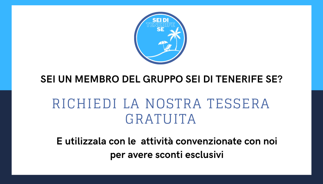 Grazie alla nostra tessera avrai sconti esclusivi su tutti i nostri locali convenzionati e potrai utilizzare il nostro gruppo facebook come punto di riferimento per qualsiasi dubbio o domande tu abbia su Tenerife